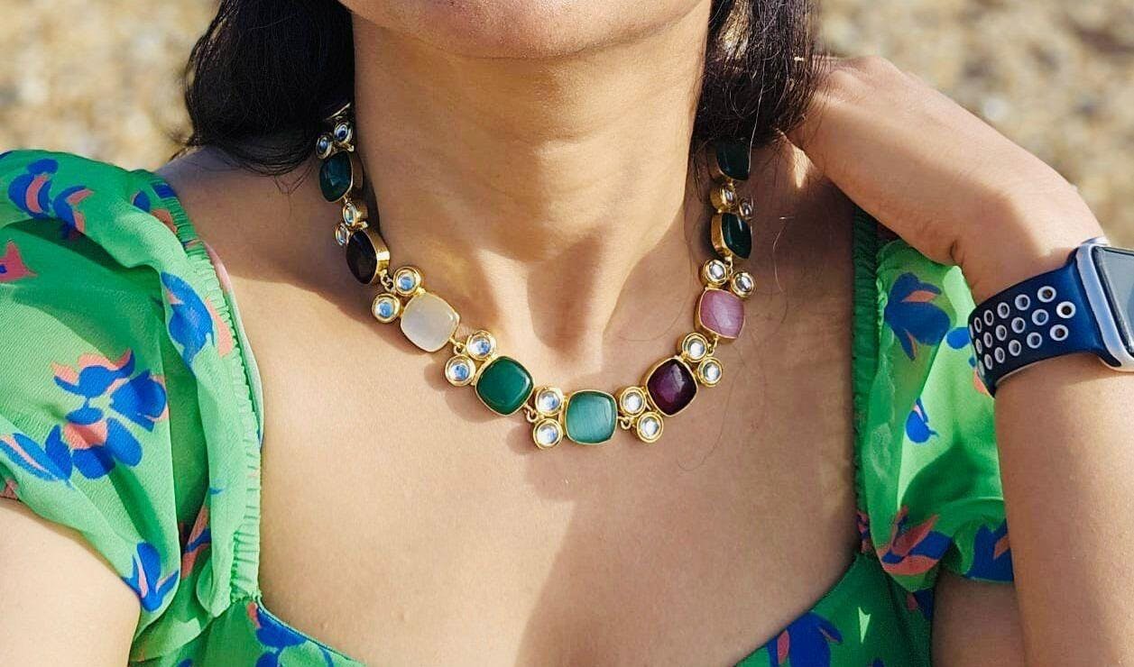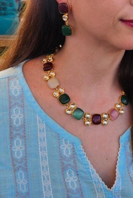 “Handcrafted with precision and passion, our jewellery reflects the dedication and skill of our artisans. Each piece is meticulously crafted by skilled artisans, ensuring that no two are exactly alike. Own a unique work of art."Unique and Personal: Since no two stones are the same, each piece is a personal statement. Natural stones are truly one-of-a-kind, shaped by nature itself. Each stone has its own unique shape, color, and pattern, meaning no two pieces of jewellery will ever be exactly the same.Natural Stone: In essence, a natural stone is more than just jewellery—it’s a wearable piece of art that celebrates the beauty of the earth and the creativity of the artisan. Whether you’re drawn to its aesthetic charm or its potential benefits, it’s a piece that invites you to embrace your unique style and connect with nature’s timeless elegance.Base Material: The necklace is crafted from brass, a durable alloy known for its versatility and ability to mimic the look of gold. Brass provides a sturdy foundation for the choker, ensuring longevity and structural integrity.Finish: The brass is enhanced with a gold-plated polish, giving the necklace a lustrous, golden sheen.Practical Considerations and Care: To maintain the necklace’s beauty and longevity, proper care is essential. It should be stored in a cool, dry place away from direct sunlight to prevent discoloration or damage to the gold plating. After wearing, gently wipe the necklace with a soft, dry cloth to remove oils, lotions, or sweat, which can dull the finish over time.