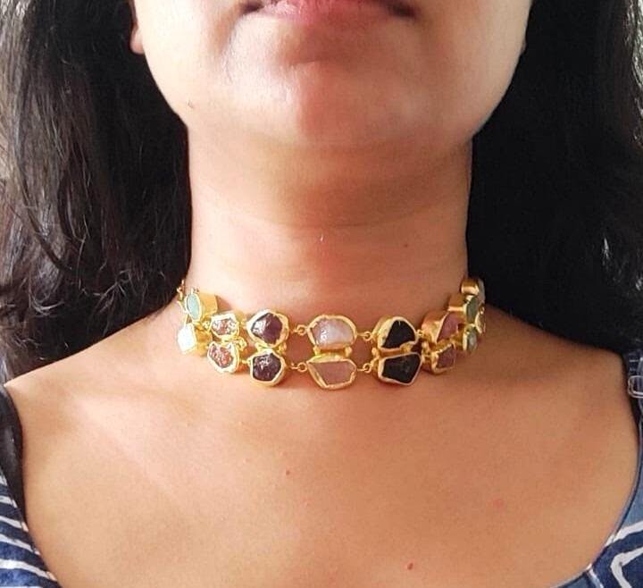 “Handcrafted with precision and passion, our jewellery reflects the dedication and skill of our artisans. Each piece is meticulously crafted by skilled artisans, ensuring that no two are exactly alike. Own a unique work of art."Unique and Personal: Since no two stones are the same, each piece is a personal statement. Natural stones are truly one-of-a-kind, shaped by nature itself. Each stone has its own unique shape, color, and pattern, meaning no two pieces of jewellery will ever be exactly the same.Natural Stone: In essence, a natural stone is more than just jewellery—it’s a wearable piece of art that celebrates the beauty of the earth and the creativity of the artisan. Whether you’re drawn to its aesthetic charm or its potential benefits, it’s a piece that invites you to embrace your unique style and connect with nature’s timeless elegance.Base Material: The necklace is crafted from brass, a durable alloy known for its versatility and ability to mimic the look of gold. Brass provides a sturdy foundation for the choker, ensuring longevity and structural integrity.Finish: The brass is enhanced with a gold-plated polish, giving the necklace a lustrous, golden sheen.Practical Considerations and Care: To maintain the necklace’s beauty and longevity, proper care is essential. It should be stored in a cool, dry place away from direct sunlight to prevent discoloration or damage to the gold plating. After wearing, gently wipe the necklace with a soft, dry cloth to remove oils, lotions, or sweat, which can dull the finish over time.